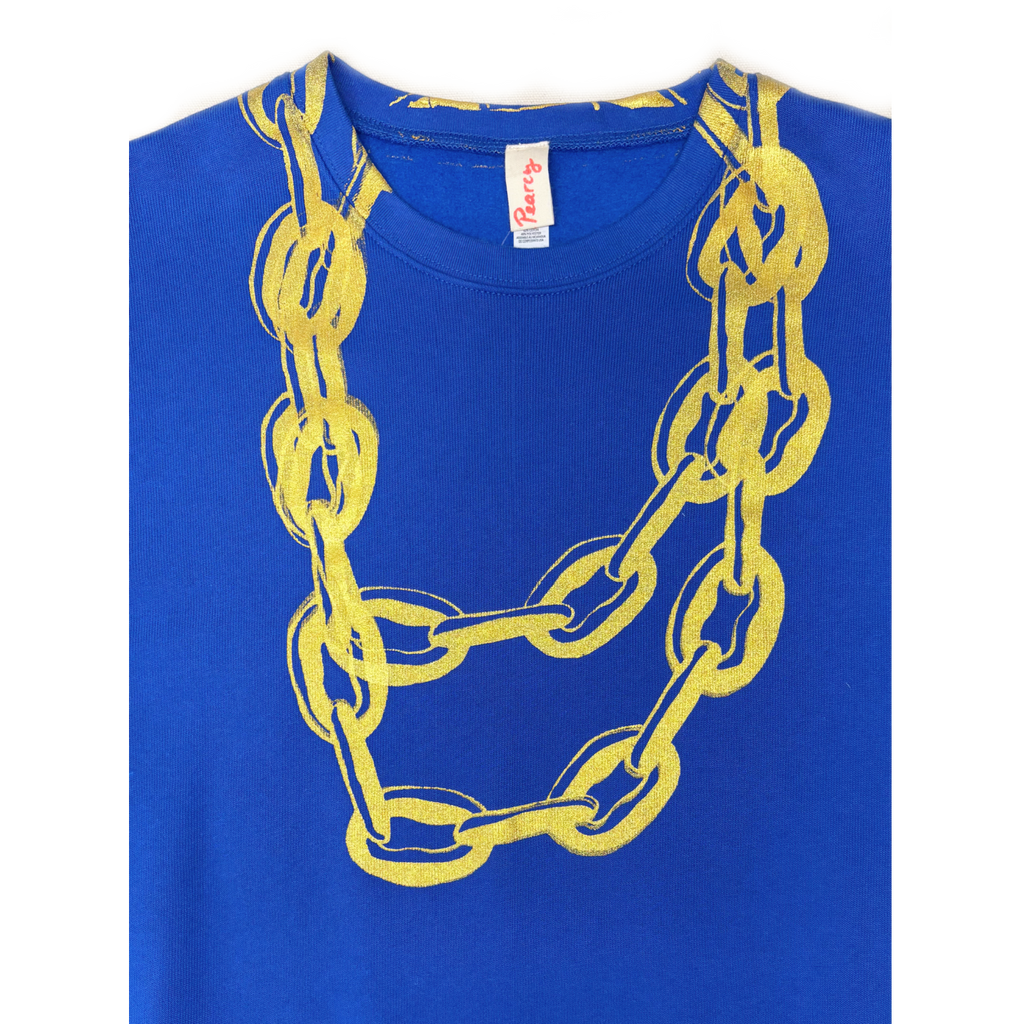 Super soft and cozy fleece sweatshirt, handprinted with my 'Bling' print in sparkly metallic gold ink on cobalt blue shirt. 52% cotton/48% polyester fleece, one-of-a-kind double-chain print.