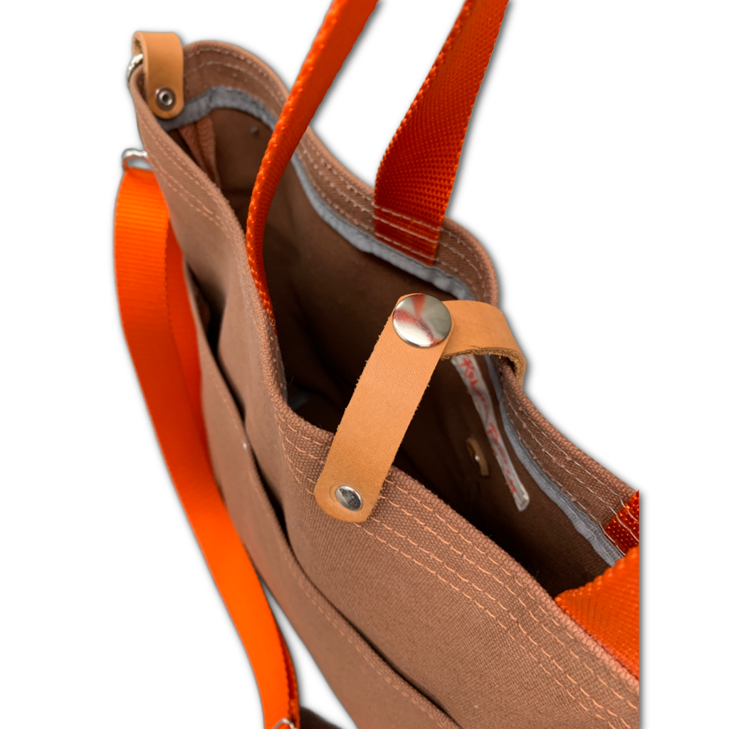 This one-of-a-kind tote is based on my small vessel tote and built for utility. Made with water-resistant heavy duty waxed canvas in a beautiful caramel color with orange top stitching and webbing handles/strap. 4 pockets around the outside of the bag will help you sort your small bits and the interior is open for your larger stuff. Adjustable webbing strap will allow you to carry on your should or crossbody, or grab the handles. Leather tab snap closure at the top.